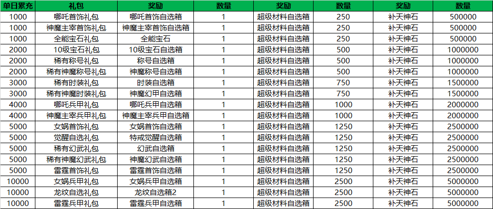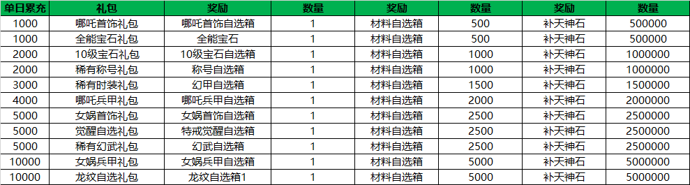 活动二:单日奖励 活动时间:2025.4.11 - 常驻(单日累充不向下兼容,领取最高充值档位礼包 备注:玩家根据自己开服申请对应的礼包码,不支持更换)